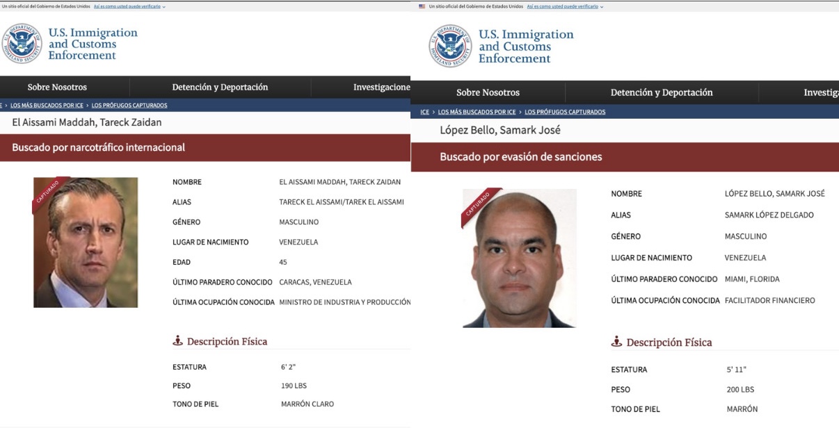 Tareck El Aissami y el empresario Samark López aparecen con estatus de “CAPTURADO” en la página web oficial del ICE 21 de febrero de 2026