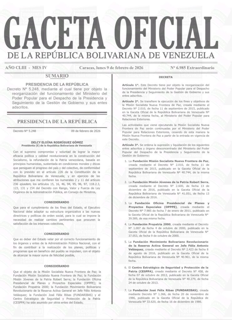 La encargada del régimen, Delcy Rodríguez, ordenó la supresión inmediata de varias misiones y fundaciones chavistas que operaban desde Miraflores, tras firmar el decreto 5.248 publicado en la Gaceta Oficial extraordinaria 6.985. La medida dejó fuera a entes que durante años vivieron del presupuesto público.