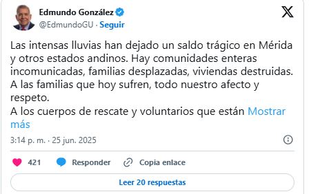 El Público TV – Caracas, 26 de Junio del 2025.Edmundo González expresó su solidaridad con afectados por las lluvias. Edmundo González Urrutia solidarizó con víctimas. Lluvias afectan Mérida, Apure, Barinas y Trujillo.