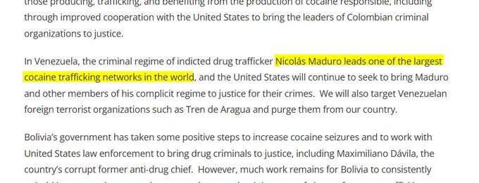 «En Venezuela, el régimen criminal del narcotraficante Nicolás Maduro, procesado, lidera una de las redes de tráfico de cocaína más grandes del mundo, y Estados Unidos seguirá buscando llevar a Maduro y a otros miembros de su régimen cómplice ante la justicia por sus crímenes. También perseguiremos a las organizaciones terroristas extranjeras venezolanas, como el Tren de Aragua, y las expulsaremos de nuestro país», señaló el documento.