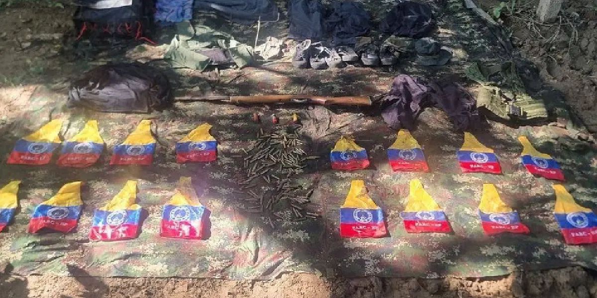La institución precisó que en el campamento encontraron 20 brazaletes alusivos al «Frente 33 de las FARC». Según la publicación, también se incautaron un rifle, dos chalecos tácticos, un sombrero, dos portacargadores, un bolso táctico, un par de botas militares, dos pares de botas negras, cinco pantalones impermeables, un traje de buzo y 125 cartuchos de diferentes calibres.