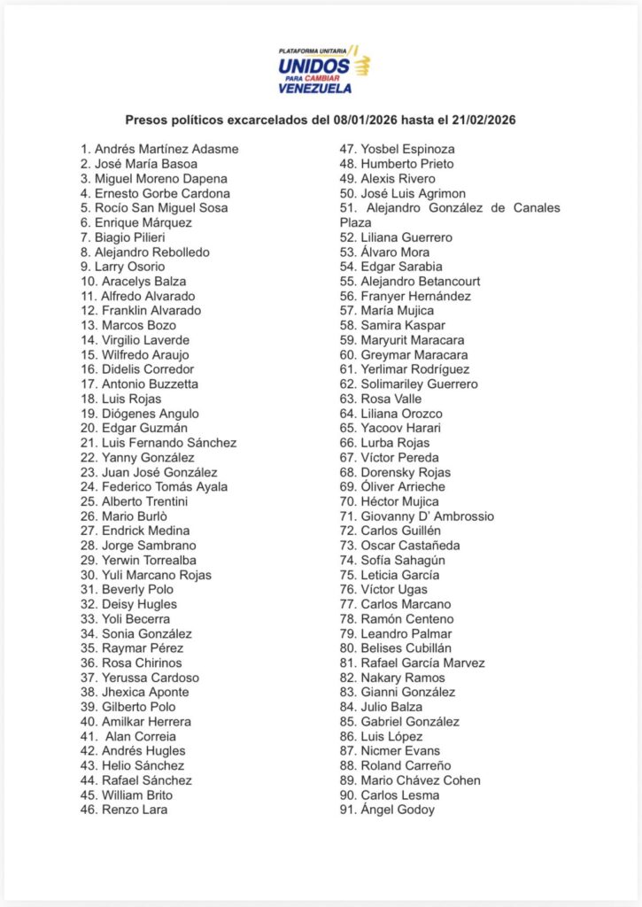 Monitoreamos – Caracas, 22 de febrero del 2026. La Plataforma Unitaria Democrática (PUD) publicó el sábado un listado actualizado con la cifra de 494 presos políticos excarcelados confirmados entre el 8 de enero y el 21 de febrero a las 10 de la noche.