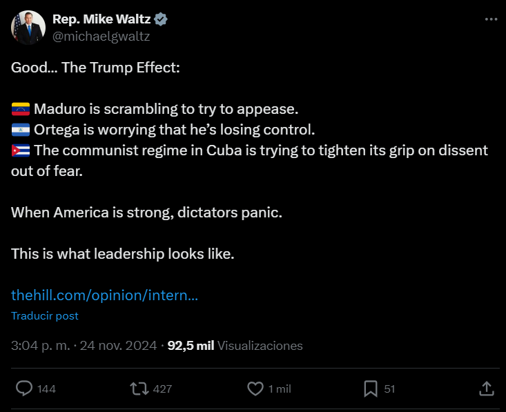 “Maduro tratando de apaciguar. Ortega preocupado porque está perdiendo el control. Cuba tratando de reforzar su control sobre la disidencia”, destacó en su cuenta de X, a lo que calificó como “el efecto Trump”.