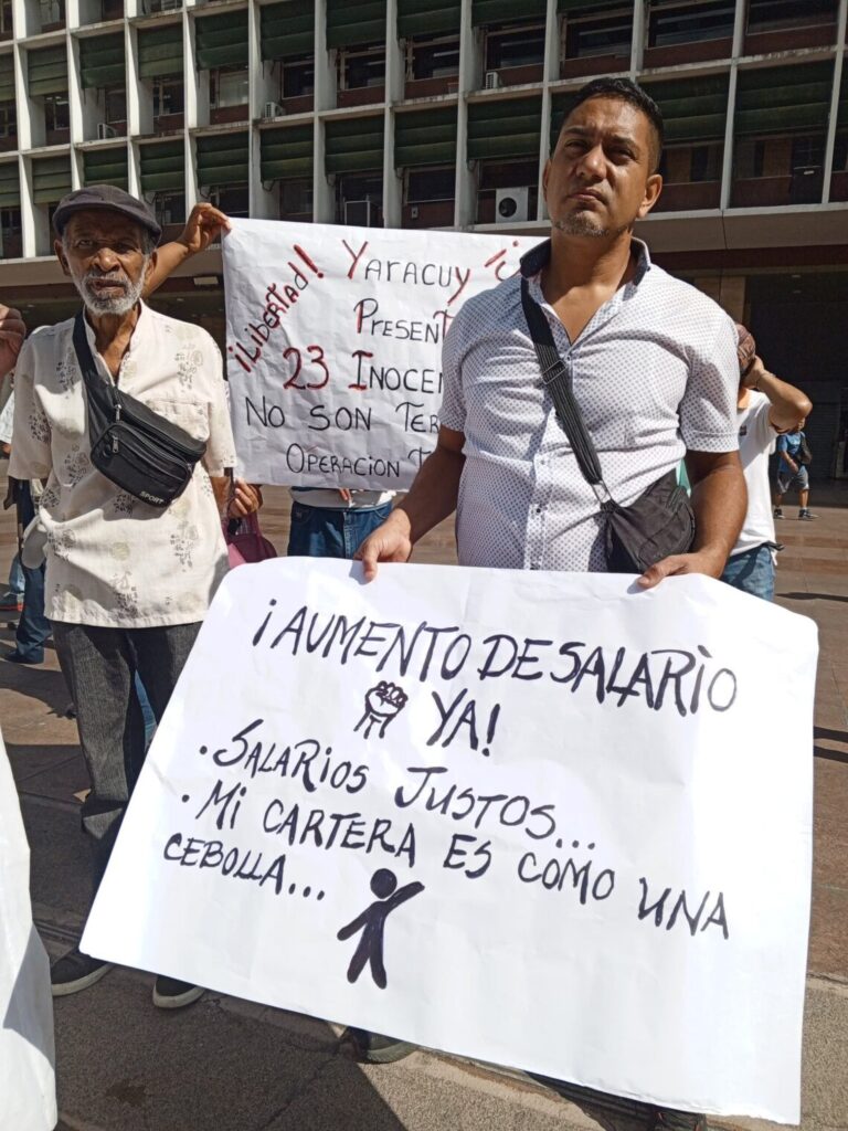 Entre las exigencias, leídas por Figueroa ante los manifestantes, priorizaron el establecimiento de un salario y pensión «mínimos» que cubran la canasta básica, así como la eliminación de los bonos para «convertirlos en salario real, con impactos de prestaciones y beneficios» laborales.