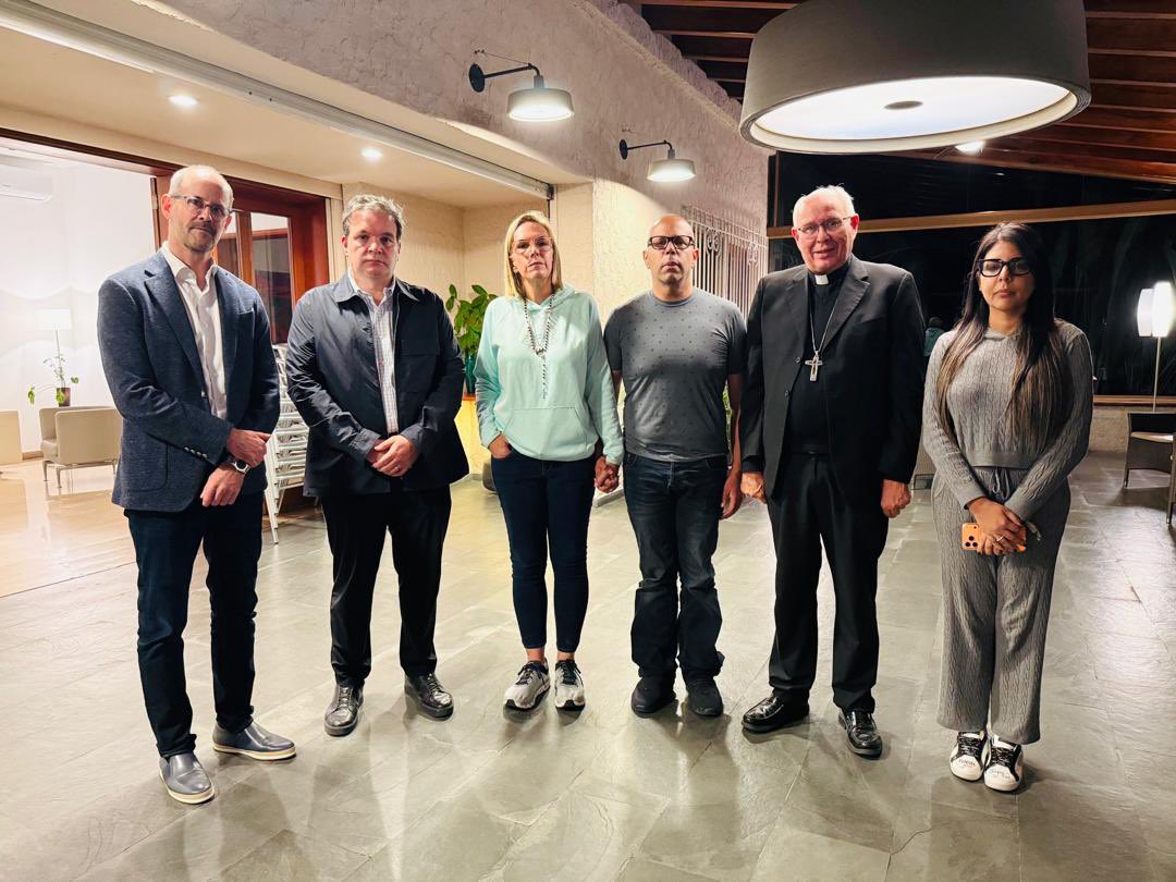 El empresario Ricardo Cusanno publicó una fotografía del yerno de Edmundo González, acompañado por su esposa, Mariana González, un diplomático suizo, el arzobispo de Caracas, Raúl Biord e Indira Urbaneja.