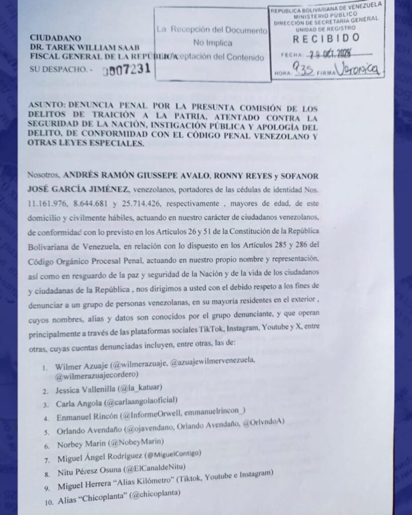 El documento, recibido el 28 de octubre de 2025 por el despacho del Fiscal General Tarek William Saab, se dirige contra personas que operan principalmente a través de plataformas digitales como TikTok, Instagram, YouTube y X.