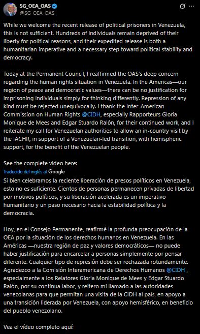 La Patilla – Caracas, 21 de Enero del 2026. El secretario general de la Organización de los Estados Americanos (OEA), Albert Ramdin, exigió este miércoles la liberación total de los presos políticos en Venezuela y advirtió que las excarcelaciones recientes, aunque positivas, “no son suficientes”, ya que cientos de personas continúan privadas de libertad por motivos políticos.