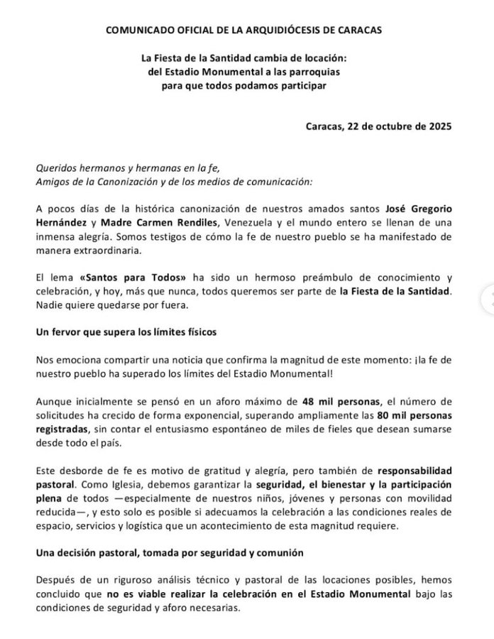 Alberto News – Caracas, 22 de Octubre del 2025. La Arquidiócesis de Caracas informó este miércoles 22 que la «Fiesta de la Santidad», como se denominó a la celebración por la canonización de san José Gregorio Hernández y santa Carmen Rendiles, ya no se realizará en el estadio monumental Simón Bolívar el próximo 25 de octubre. La actividad se trasladó a las parroquias de Caracas y el resto del país por el «desborde» de aforo.