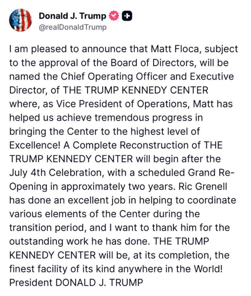 “Me complace anunciar que Matt Floca será nombrado director ejecutivo y jefe de operaciones del Trump Kennedy Center”, expresó el mandatario en su publicación.