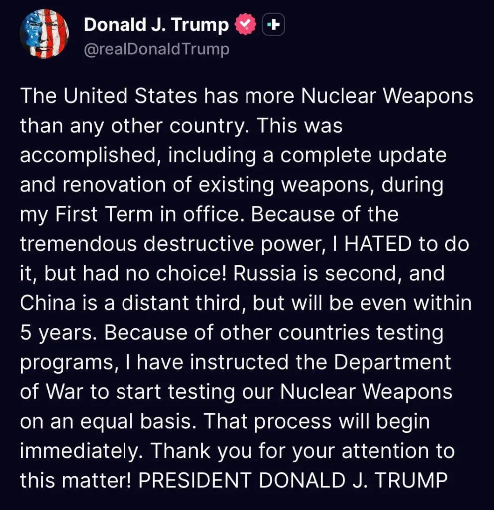El Cooperante – Caracas, 30 de Octubre del 2025. El presidente de Estados Unidos, Donald Trump, anunció este jueves que ha ordenado al ejército reanudar «de inmediato» las pruebas de armas nucleares, poniendo fin a una pausa de más de tres décadas.