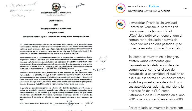 La institución aclaró que existen varios elementos que sustentan la falsificación de los documentos oficiales de la universidad, como el uso del escudo de la UCV en otra presentación.